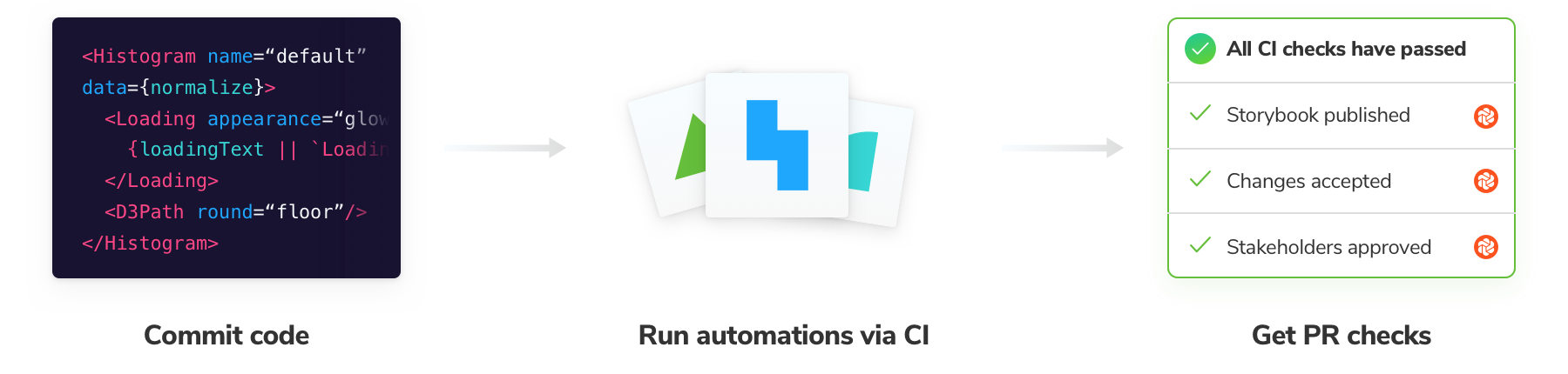 The testing workflow starts by isolating components using Storybook. Then run checks while you code to get a faster feedback loop. Finally, execute your entire test suite using continuous integration.