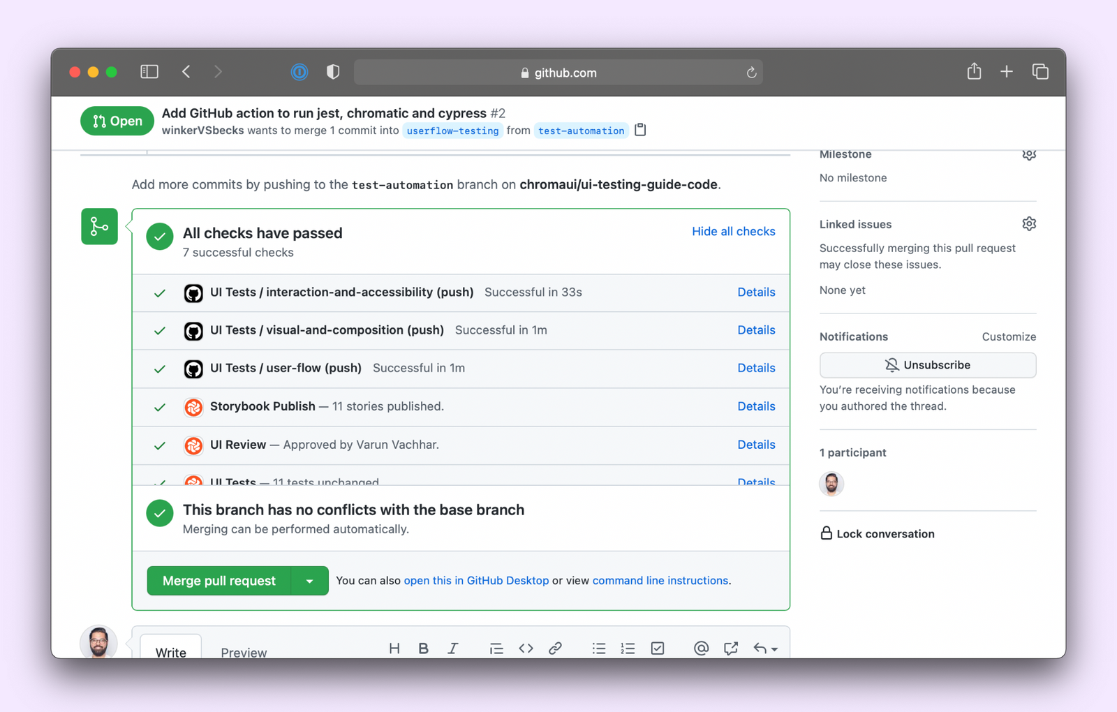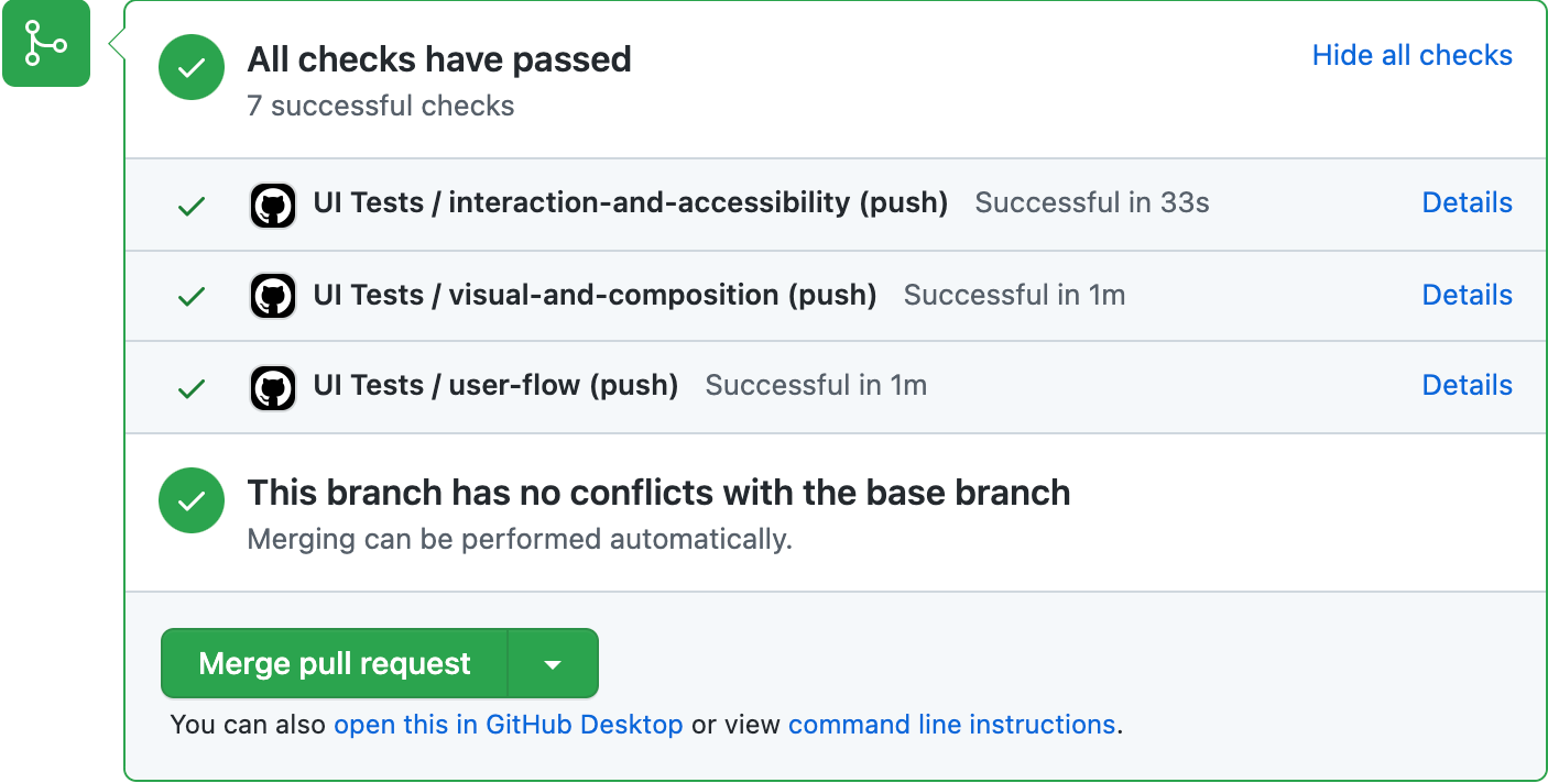 Success! You’ve automated your testing workflow. When you open up a PR it’ll run the test runner, Chromatic and Cypress in parallel and display the results on the PR page itself.