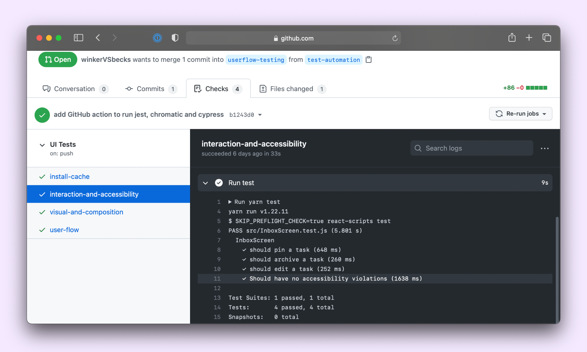 To catch regressions you need to run on all your components. You can do that by importing stories into a test file and then running an accessibility audit using jest-axe. All violations will be reported back to the PR page.