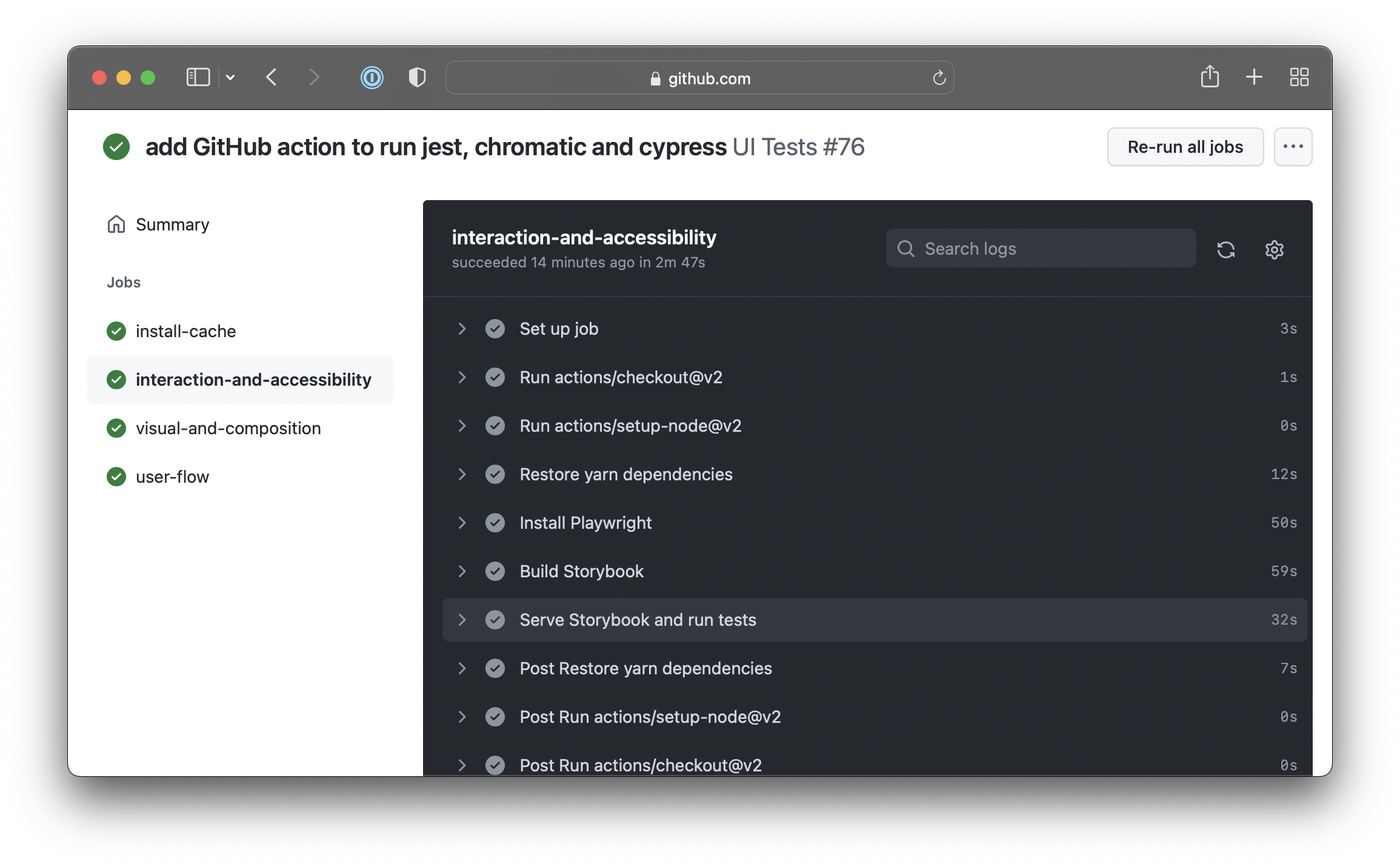 Run yarn run test-storybook to confirm that all tests are passing. Notice how Jest runs in watch mode and only executes tests related to files that changed.
